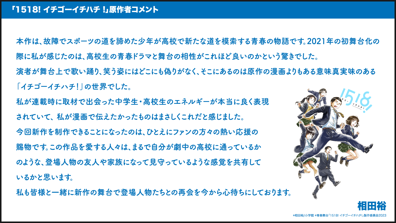 | 主催 | 青春舞台「1518!イチゴーイチハチ!」製作委員会2023 |